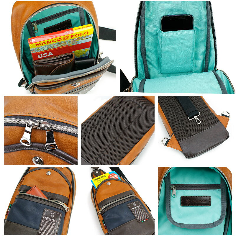◇フェイクレザーにビアンキのロゴがあしらわれた付属パーツが高級感漂う仕上がりのボディバッグ。
