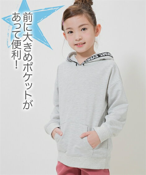 シンプルなカンガルーポケットパーカーですがフードのロゴテープ使いにも注目!